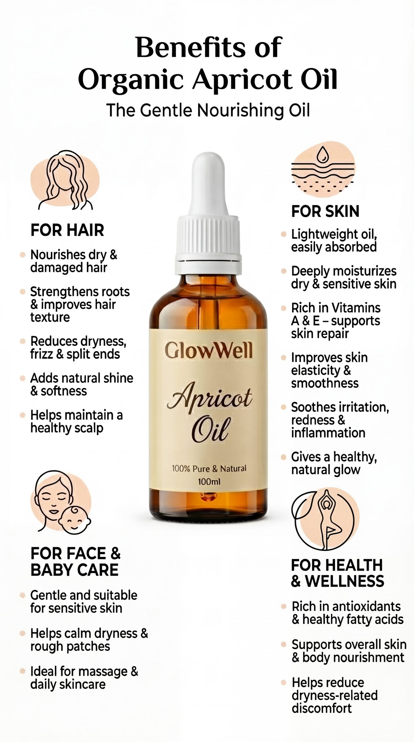 GlowWell Organic Apricot Oil is a 100% pure, cold-pressed oil rich in Vitamins A & E. It deeply nourishes hair, skin, face, and sensitive areas, making it ideal for daily skincare, hair care, and gentle baby massage.