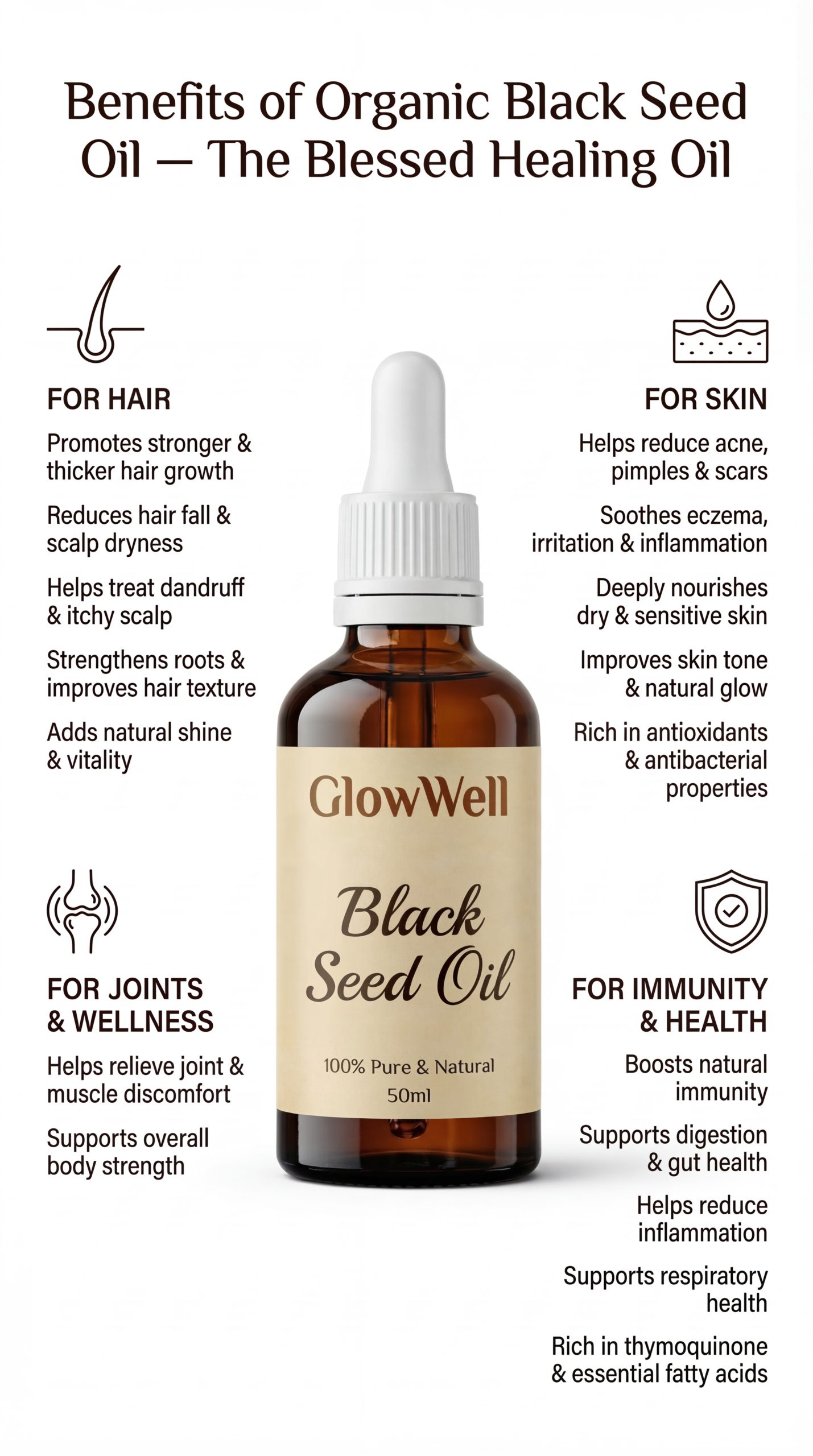 GlowWell Organic Black Seed Oil is a premium natural oil designed to support hair, skin, immunity, and overall wellness. It promotes stronger and thicker hair growth, reduces hair fall and scalp dryness, helps treat dandruff and itchy scalp, strengthens roots, improves hair texture, and adds natural shine and vitality.