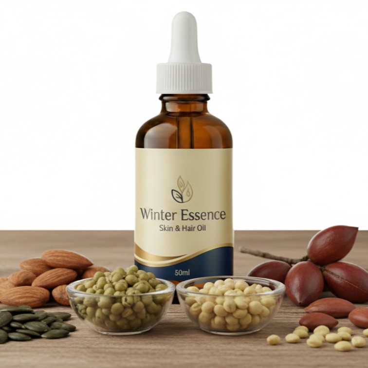 Lightweight and fast-absorbing, Winter Essence Oil is ideal for everyday use on skin, hair, and scalp. Its gentle formula ensures hydration and care while supporting overall skin and hair health naturally. Perfect for those seeking an organic, premium solution for hair and skin nourishment.
