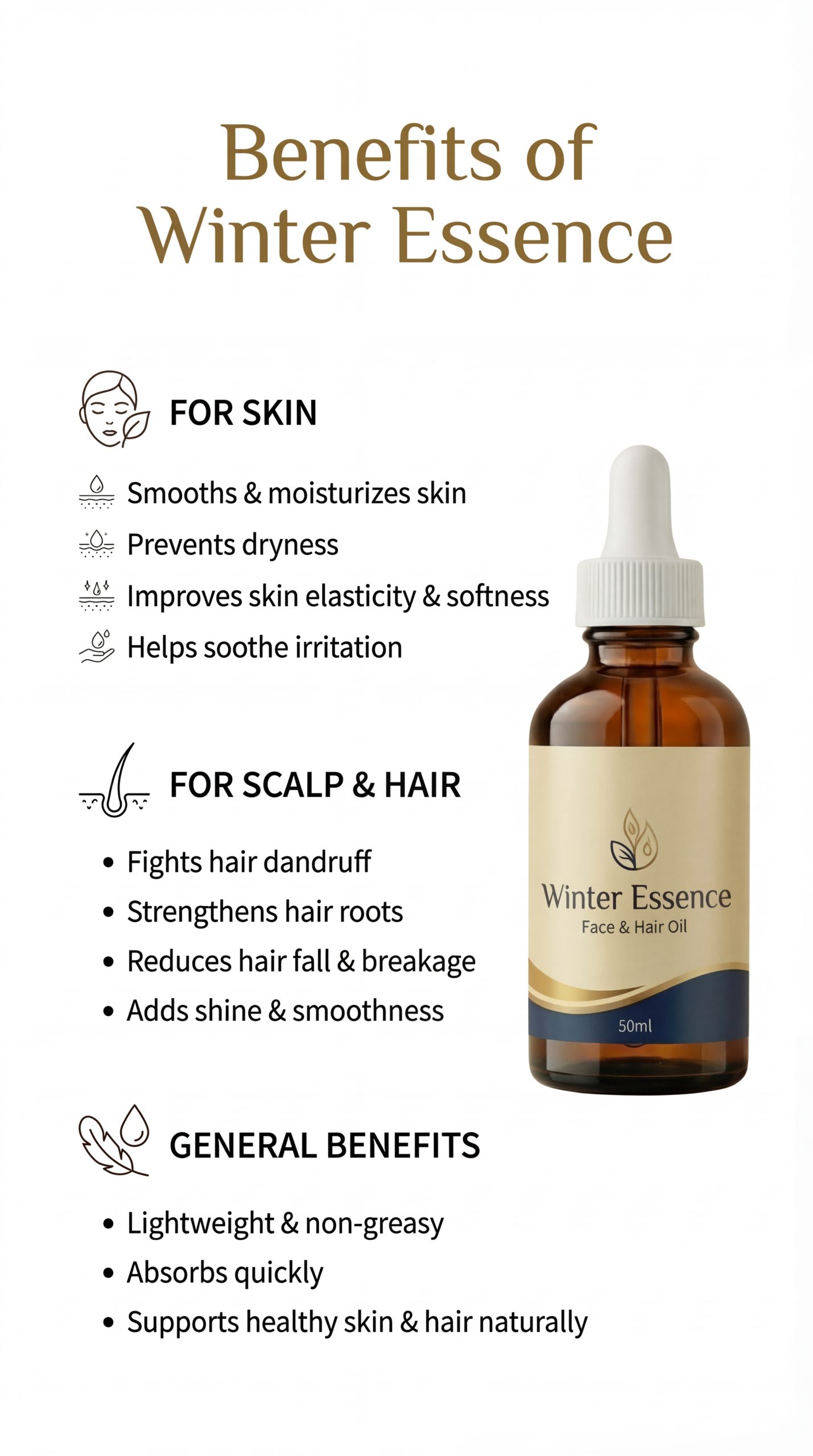 This nourishing oil strengthens hair roots, reduces hair fall and breakage, and effectively combats dandruff and scalp dryness. Winter Essence Oil adds natural shine, smoothness, and helps prevent premature greying, making it an essential part of your hair care routine.